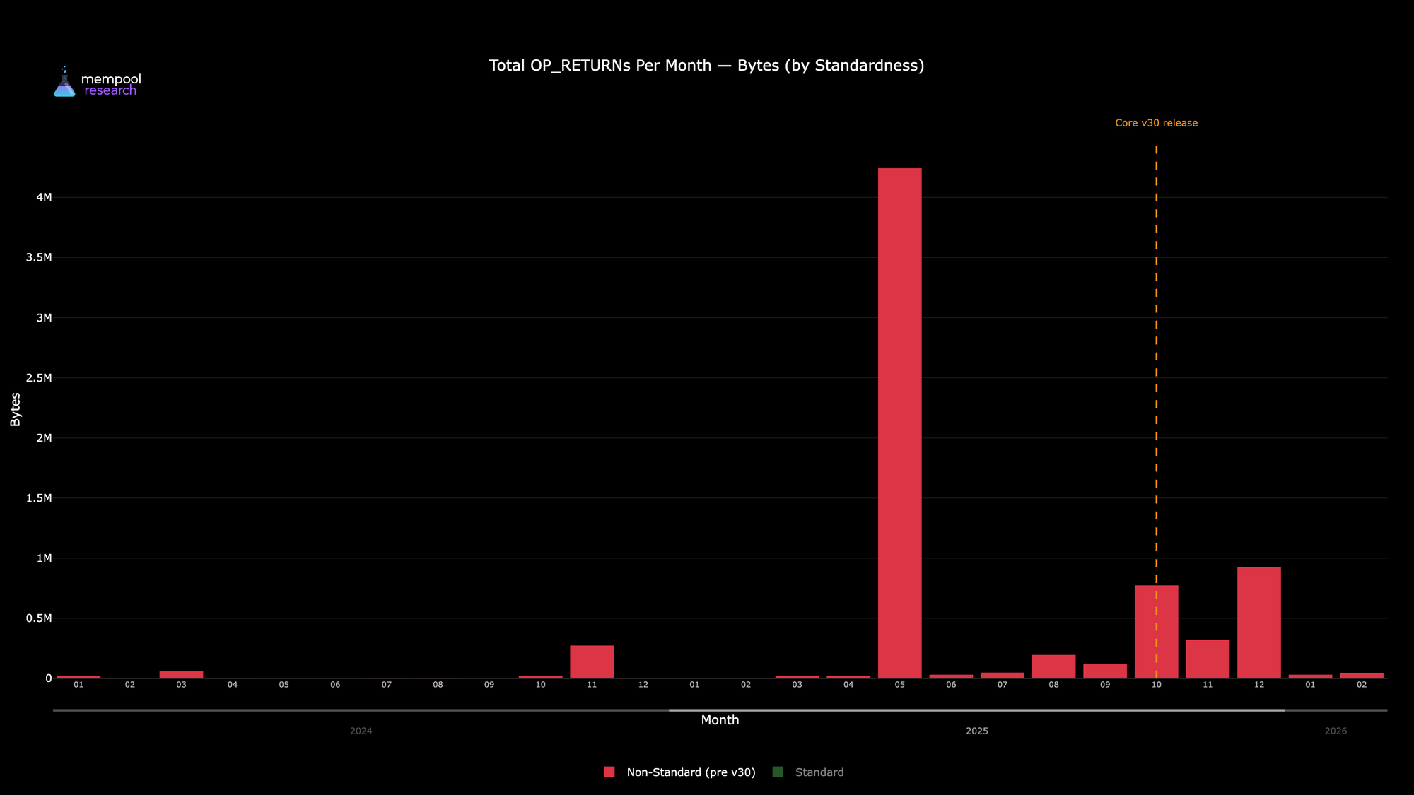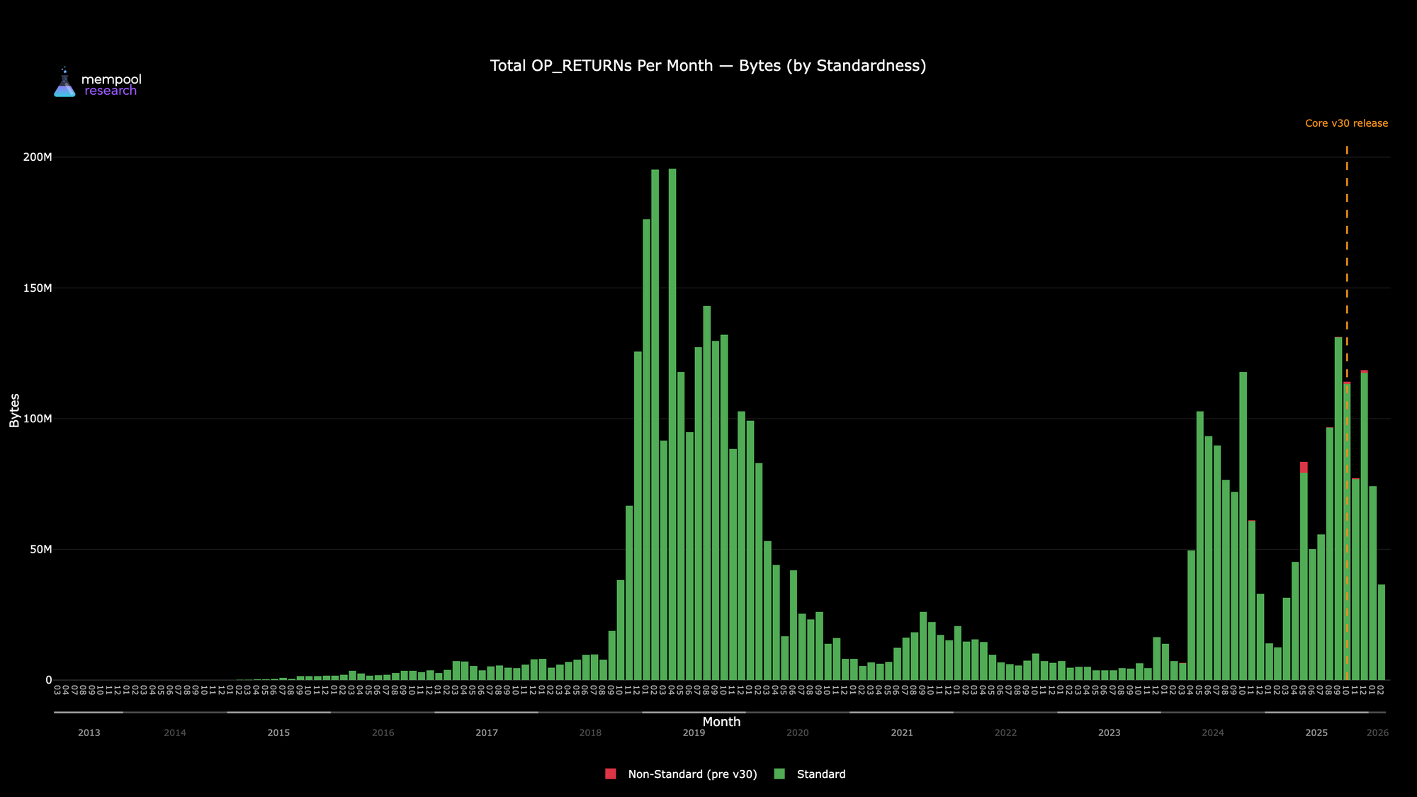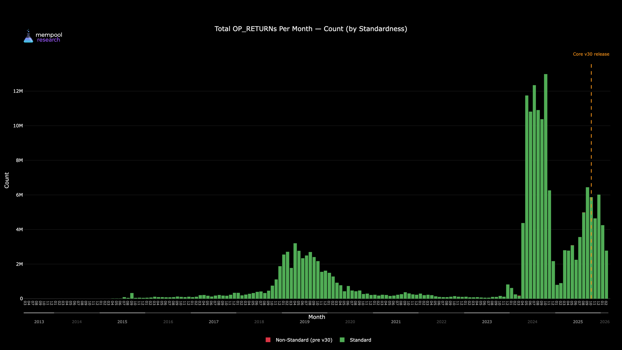 We see that there were three spikes in the number of OP_RETURNs during 2019, 2024 and 2025, of which ~all were standard.