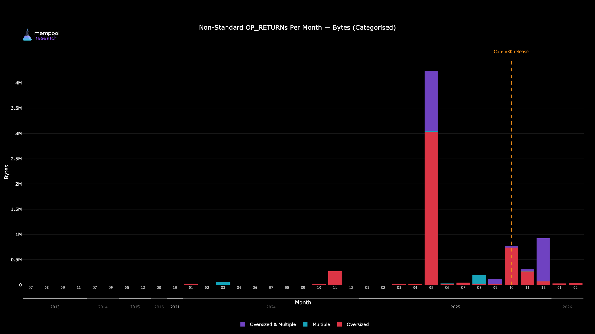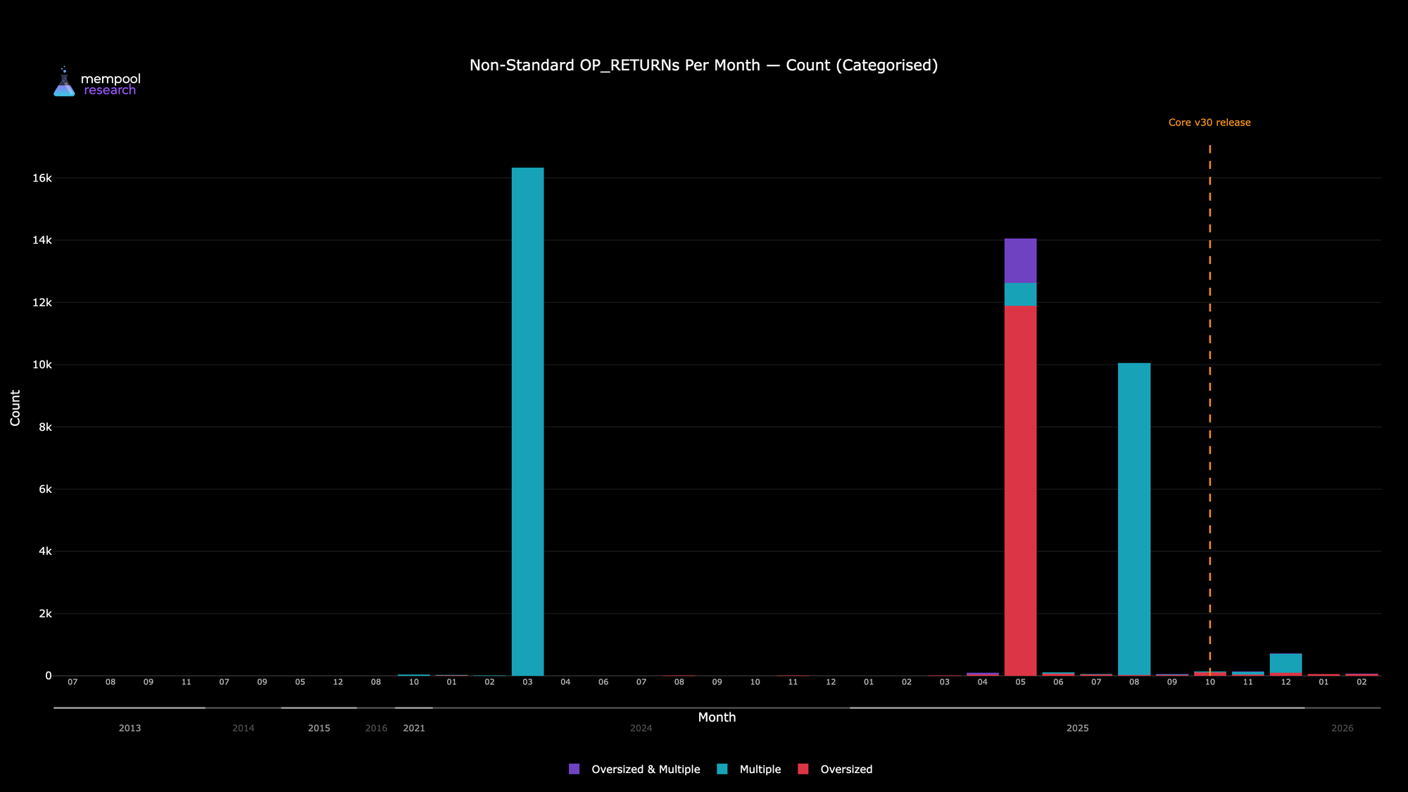 We see that the March 2024 & August 2025 spikes were caused by multiple OP_RETURNs per transaction, none of which individually were oversized.