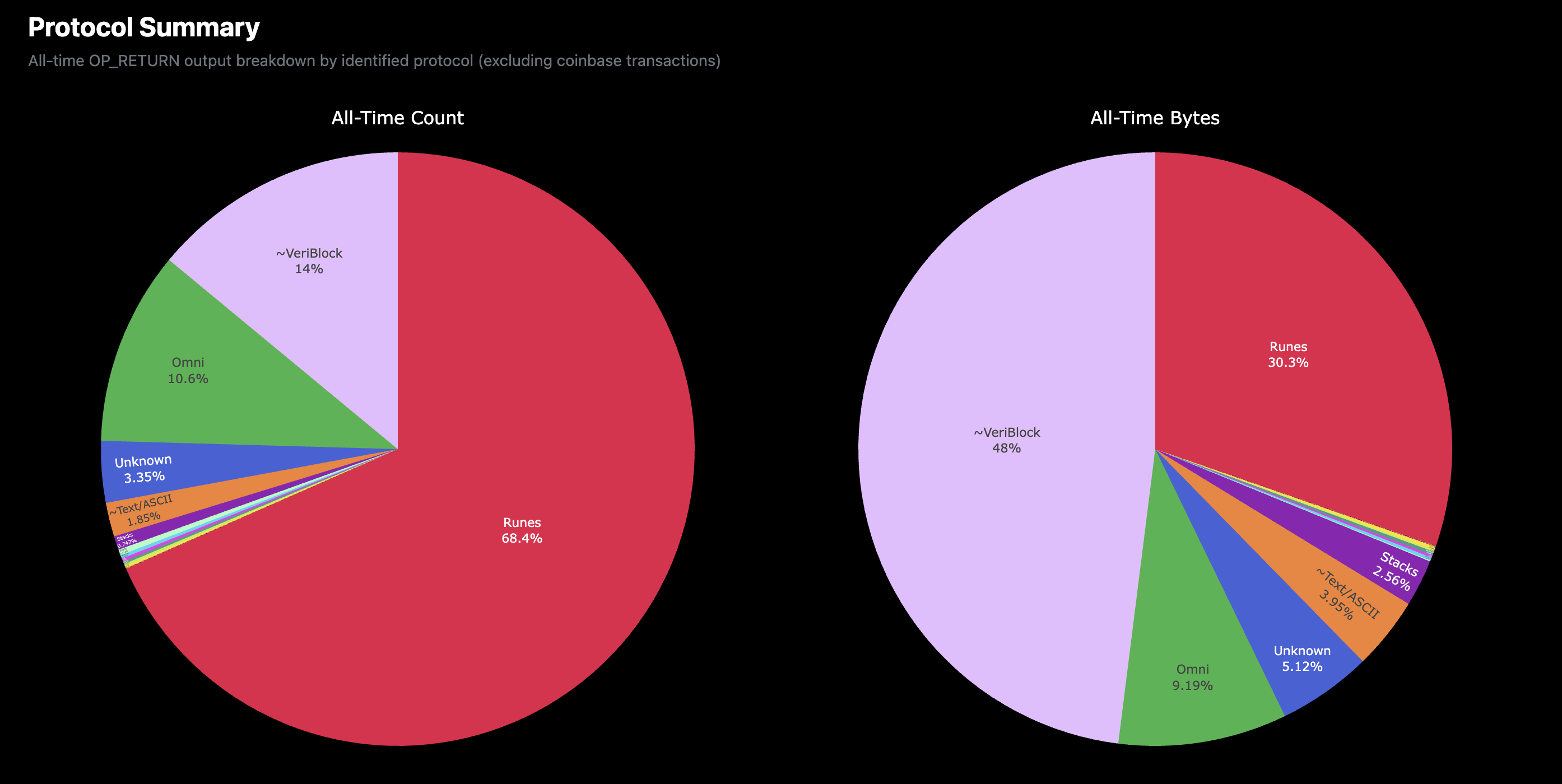 We see that veriblock was responsible for most of the 2019 wave (note, later instances of veriblock are likely other protocols which happened to have the same number of bytes as a veriblock OP_RETURN).