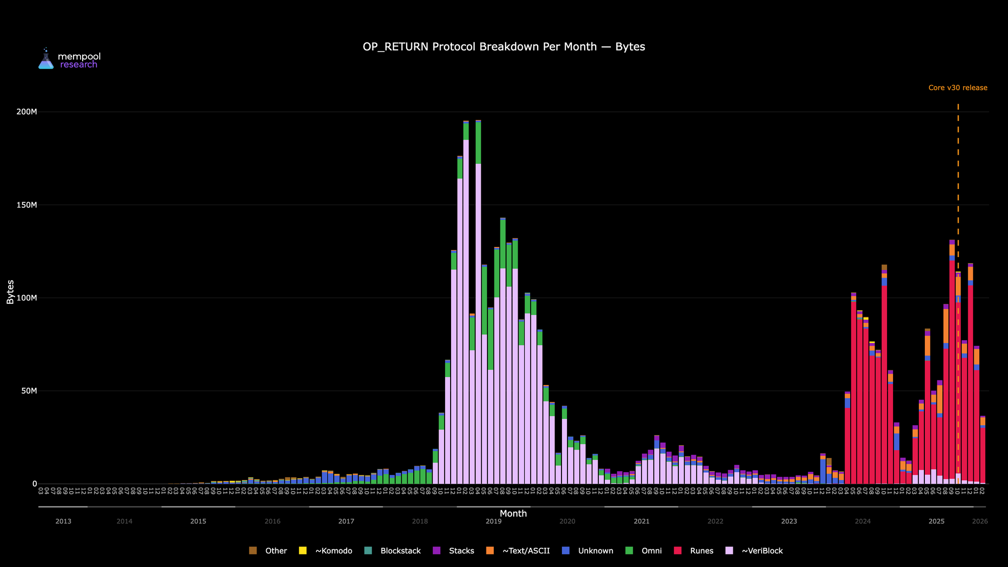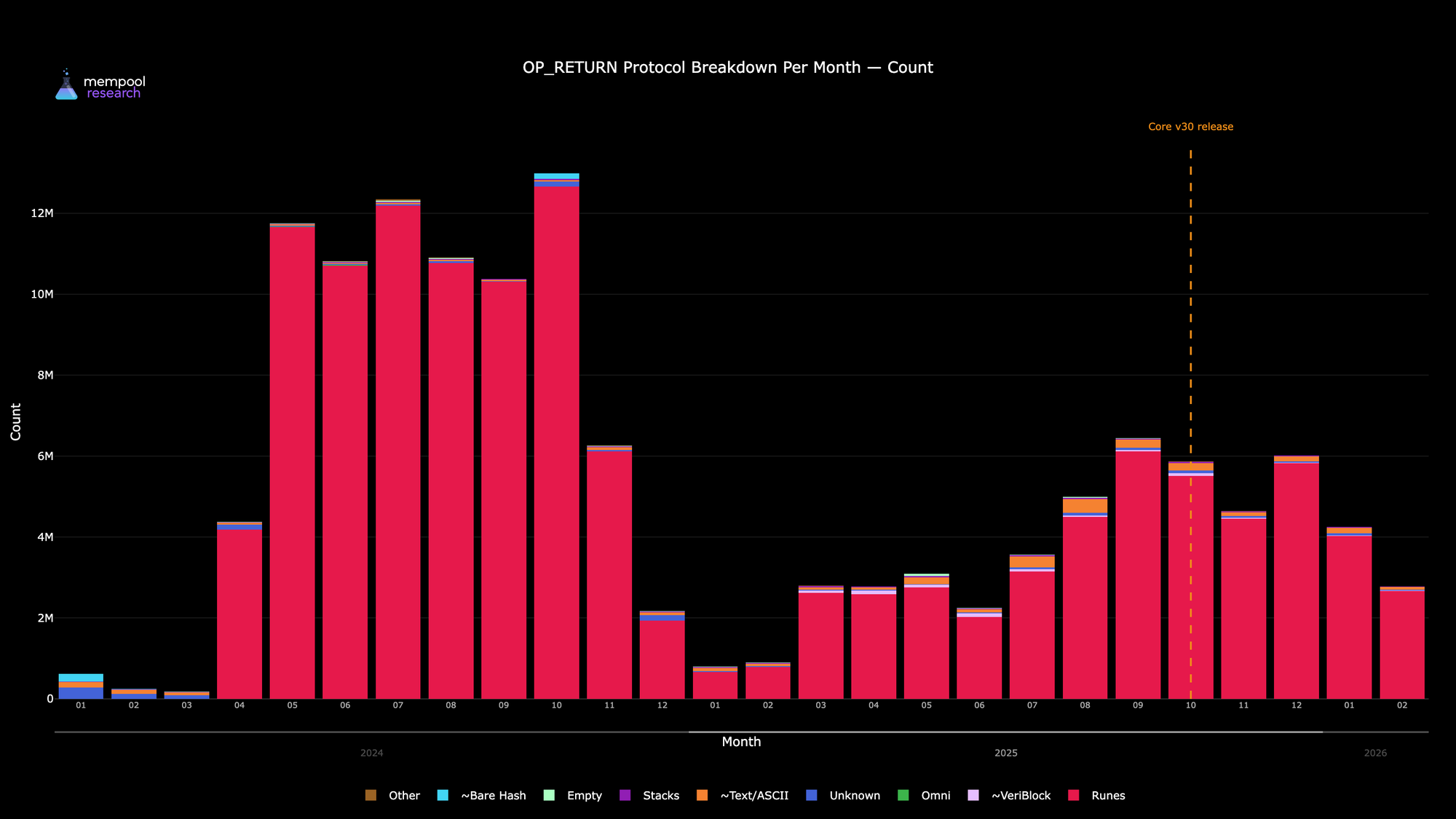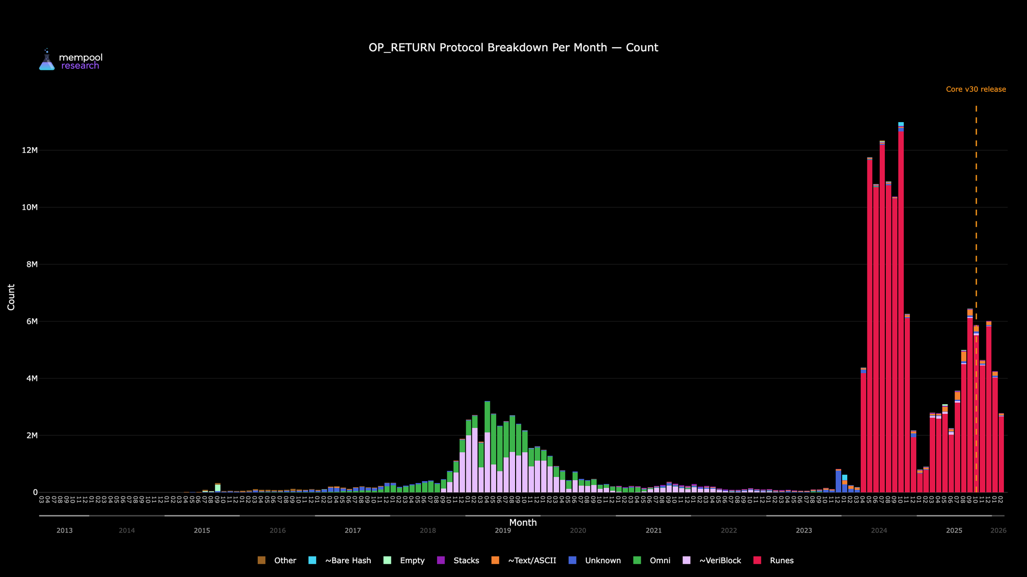 - There was a decrease in the number of OP_RETURN outputs following the release of core v30.