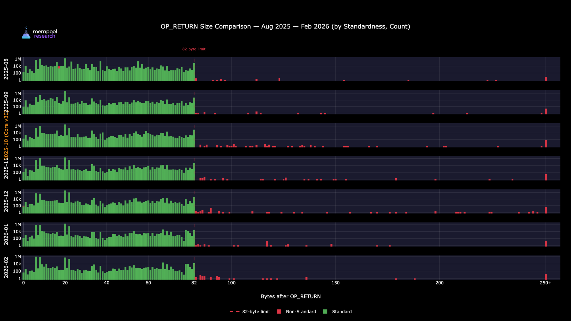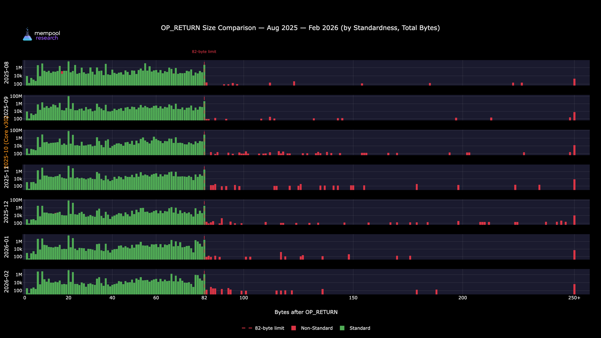 Finally, to visualise this data in another way, we show a histogram of the size of OP_RETURN bytes in the months preceding and following the release of bitcoin core v30.